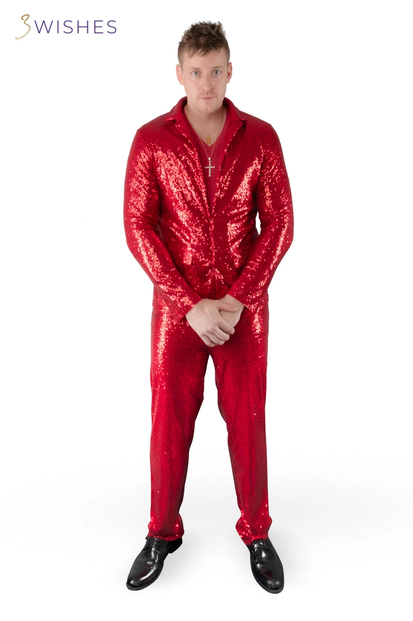 Rock out with your… socks(?) out in this Rad Red Rapper costume featuring a red sequin suit jacket and matching pants. (T-shirt not included.)