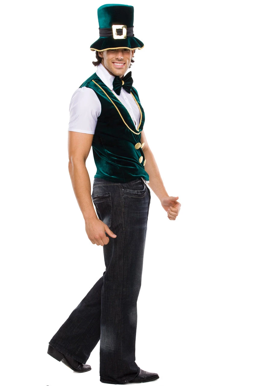 This Men’s Leprechaun costume includes a green velvet vest with an attached white shirt, gold button and trim detail, bow tie, and hat.