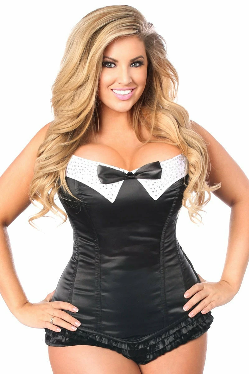 This Formal Tuxedo leather steel-boned overbust corset has a premium front zipper closure, 8 spiral steel bones, and 4 static steel bones in the back. Nickel brass grommets with laces at the back and garter loops complement the soft and comfortable 100% cotton twill lining. Add this stylish, slimming corset to spice up your wardrobe.