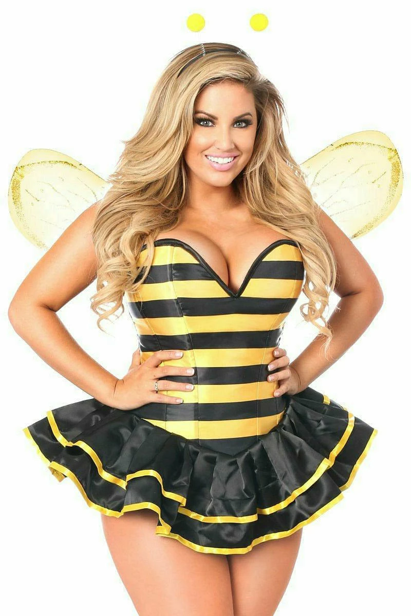 This Premium Queen Bee Corset Costume comes with a corset dress, bee antennae, and a wings accessory. The Sweetheart neckline corset dress is made of high-quality satin. The striped top and tutu skirt create a lovely bumblebee effect, and the antennae and wing accessories complete the look. Finish the look with a pair of high heel shoes.