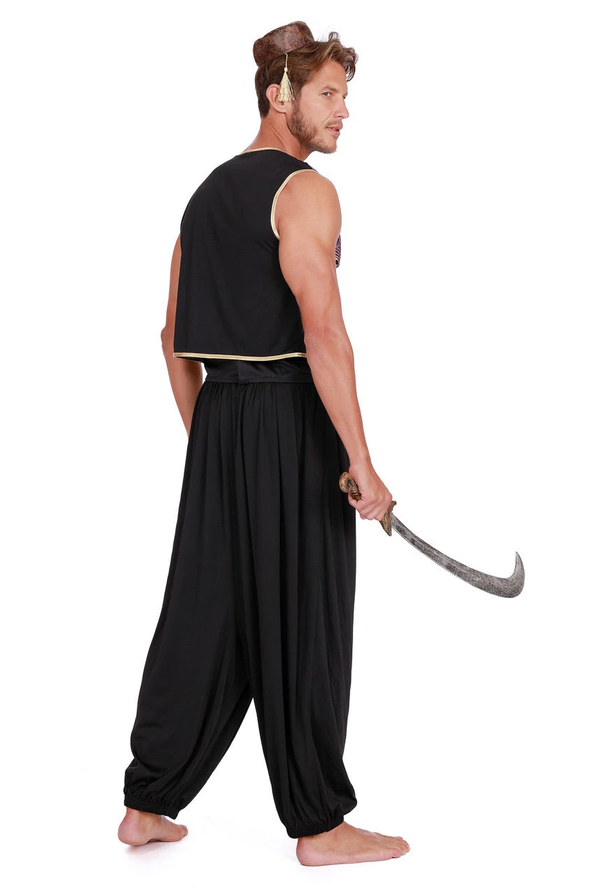 It’ll be a whole new world this Halloween in this Arabian Prince costume featuring a purple satin vest with gold pattern detail, a high waisted belt, black pants and hat with a tassel and pins. (Sword not included.)