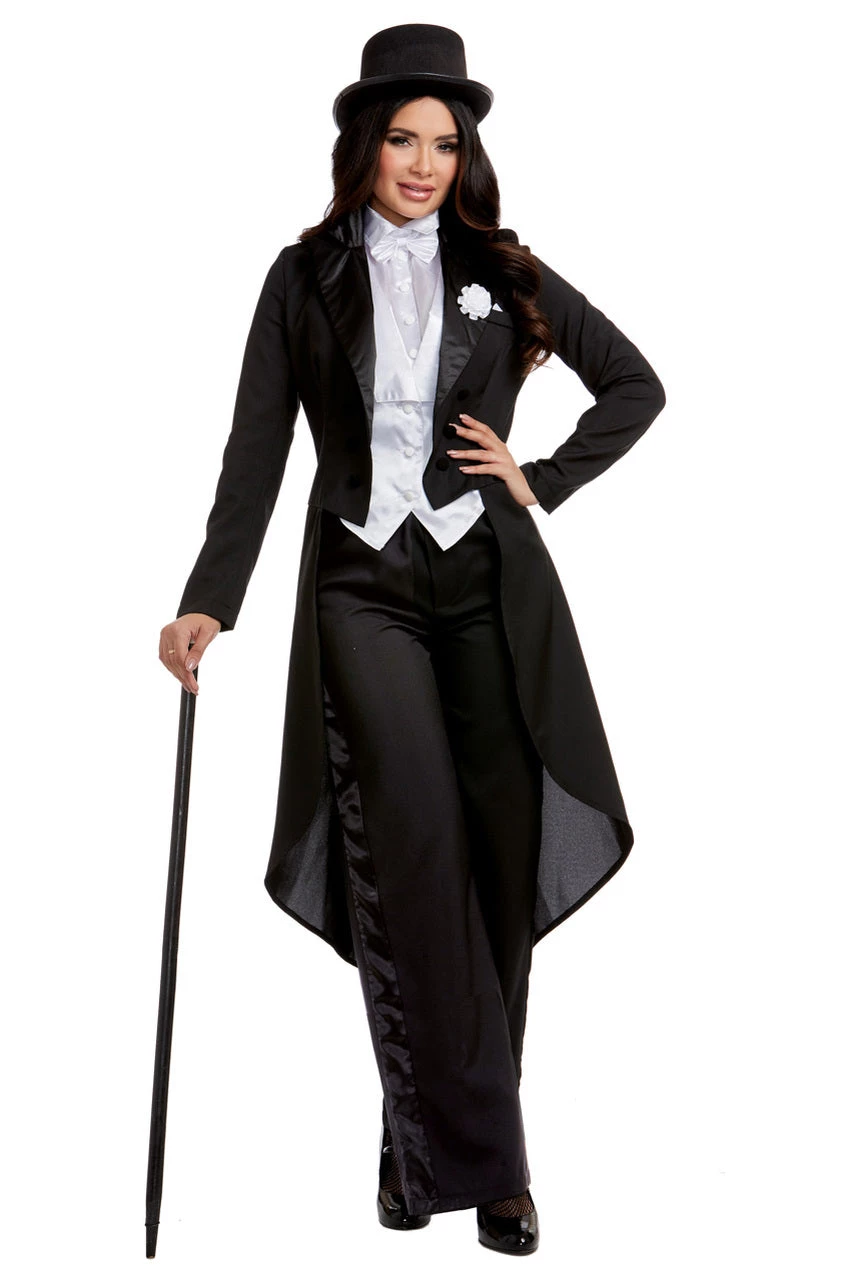 Turn some heads in the Dames Like Us costume featuring a costume jacket with attached tails, a vest with an attached dickey, a bow tie, a white boutonniere and mini shorts. (Stockings, cane and hat not included.)