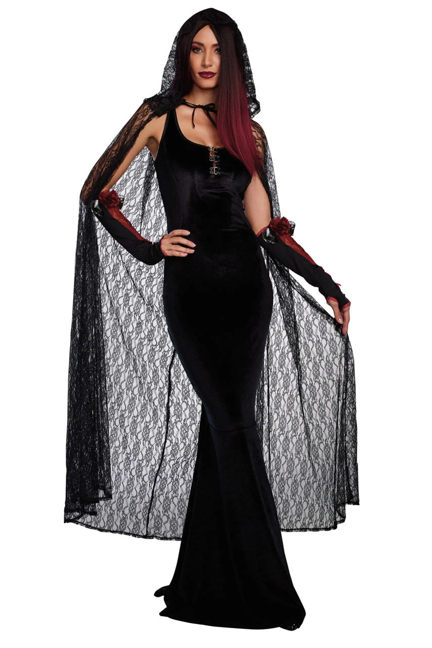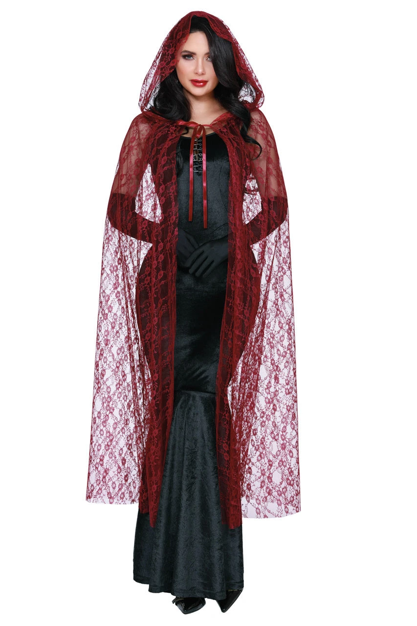 This long lace cape with an attached hood adds the perfect touch to any witch or vampire costume this Halloween.