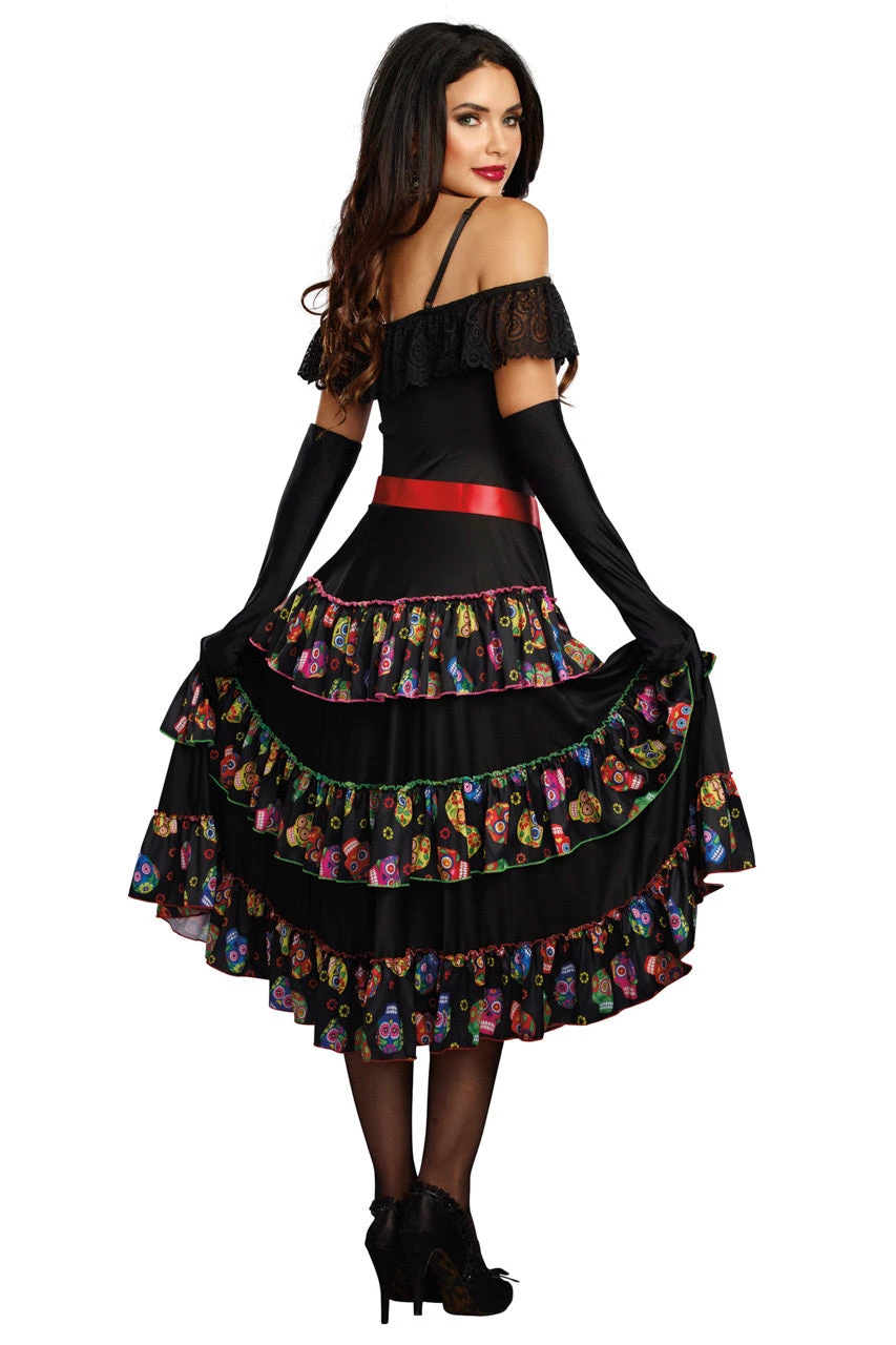 This Lady of the Dead costume includes a long dress with off the shoulder sleeves, unique skull pattern panels, skull print bodice and matching necklace. (Headpiece and gloves not included.)