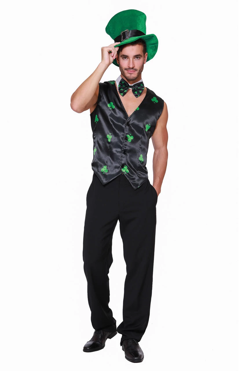 You’re sure to have the luck of the Irish in this men’s Lucky You costume featuring a black and green shamrock print vest, matching suspenders, collar with attached bow tie and collapsable green hat. (Pants not included.)