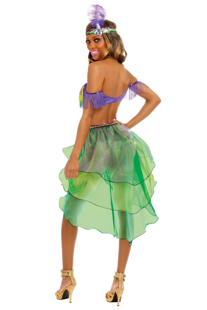 This Mardi Gras Queen costume includes a purple, yellow and green fringe crop top with off the shoulder sleeves, halter neck, a matching panty with a layered skirted back, and a feather and sequin headpiece.