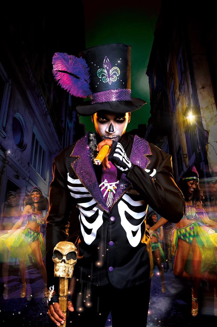 This men’s Bourbon Street Voodoo costume includes a a collapsible top hat, a skeleton printed jacket with purple lapels, a matching dickie, bone necklace, and skeleton print fingerless gloves. (Pants and cane not included.)