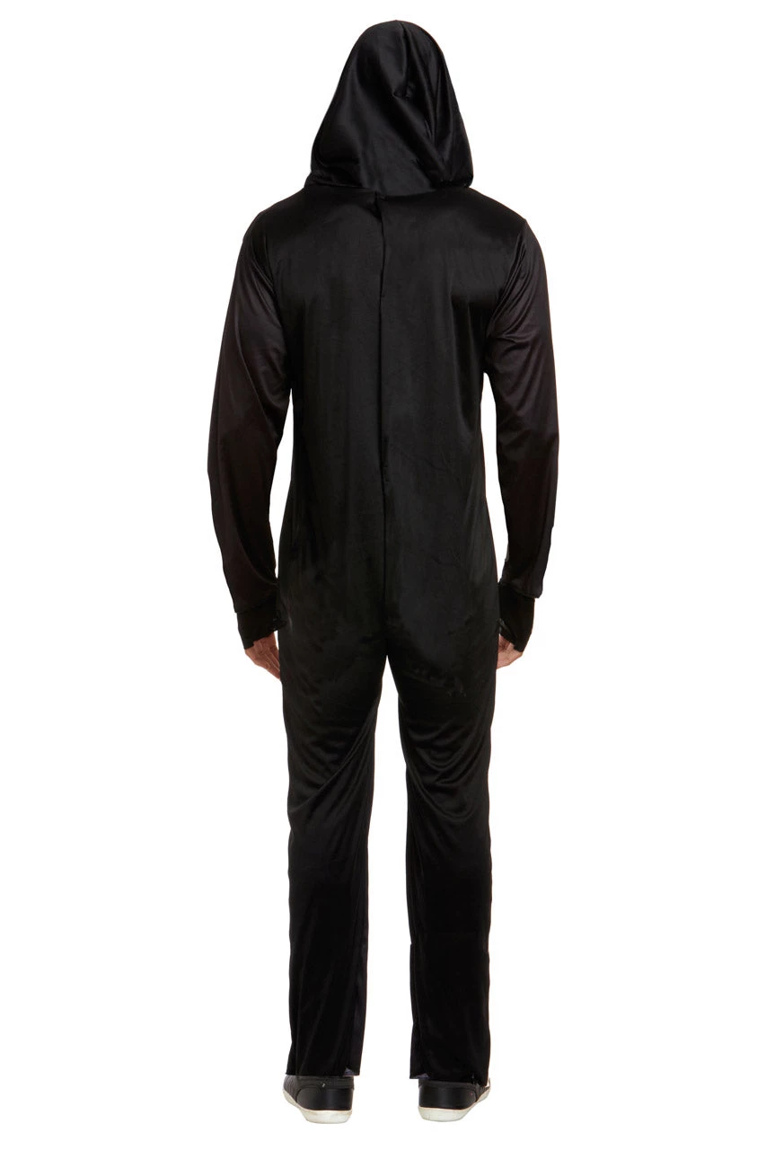 This Mr. Boneyard costume includes a black, skeleton print jumpsuit with an attached hood, skeleton mask, and skeleton print gloves.