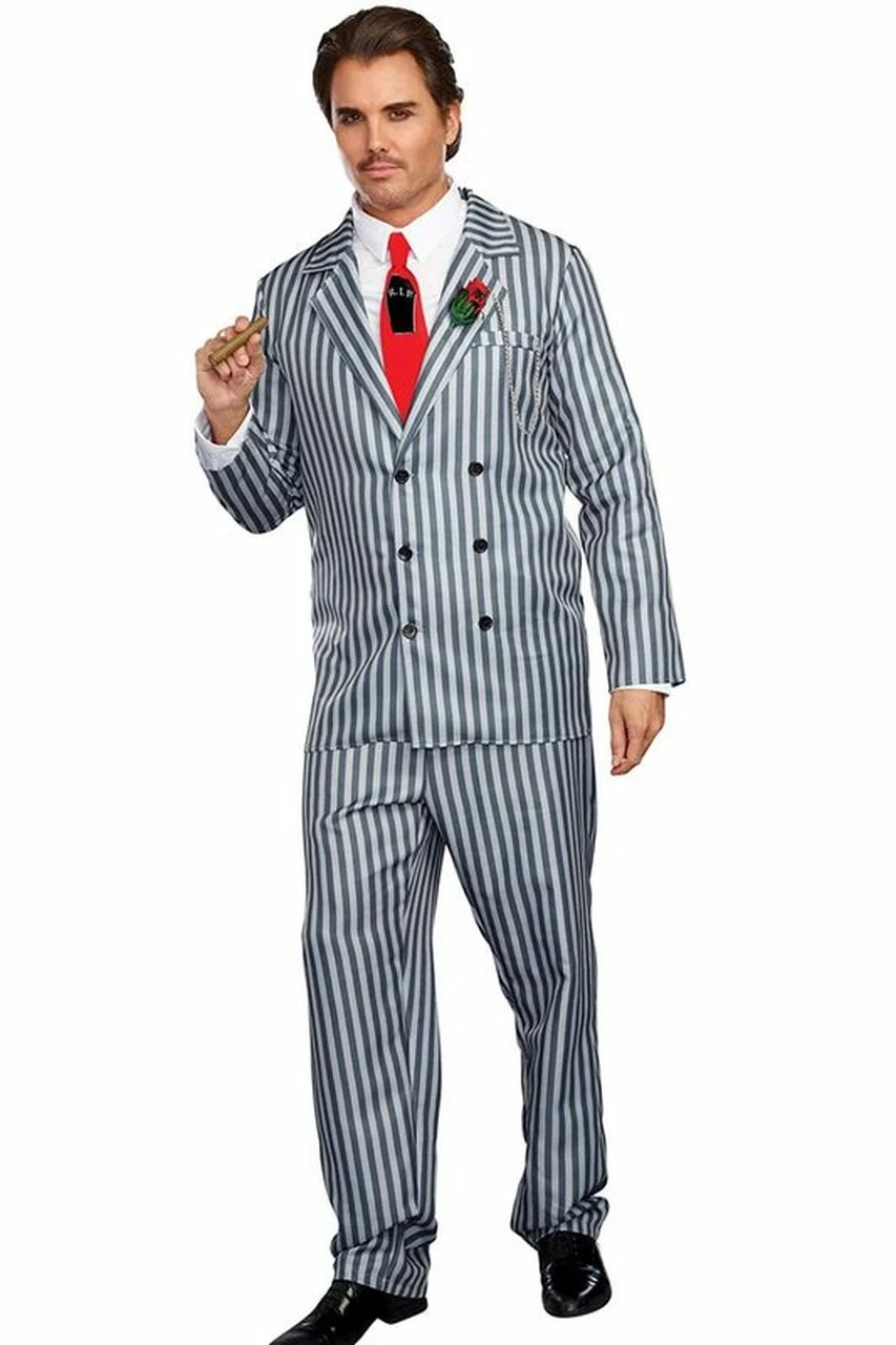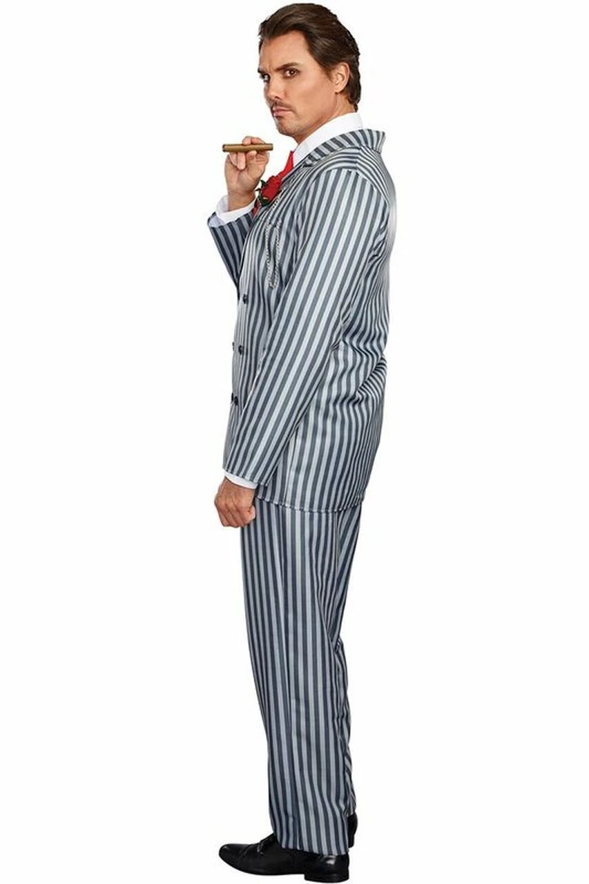 This Mr. Fright costume features a jacket with an attached boutonniere, a dickey with an attached tie and matching pants.