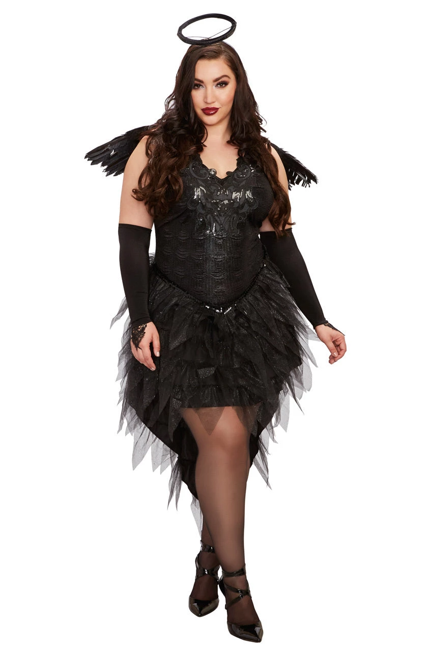 This plus size Angel of Darkness costume features a black mini dress with a ruffled, high/low skirted bottom, embroidered bust, black halo and black feather wings. (Gloves and stockings not included.)