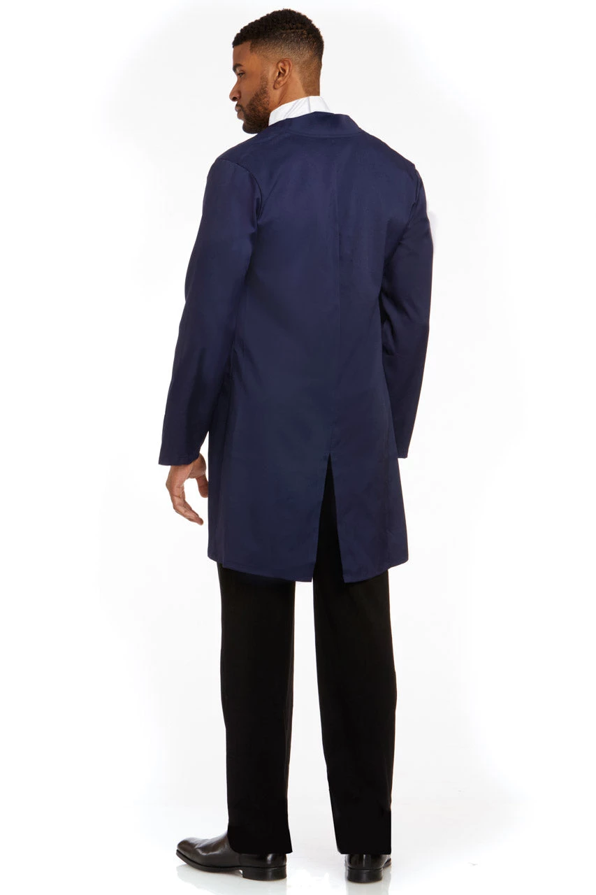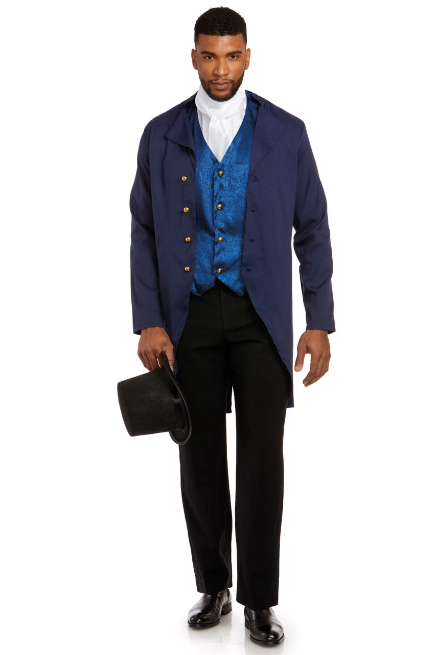This Regal Regent costume includes a navy blue jacket, royal blue brocade vest with gold buttons, and a white dickie neck piece. (Hat and pants not included.)