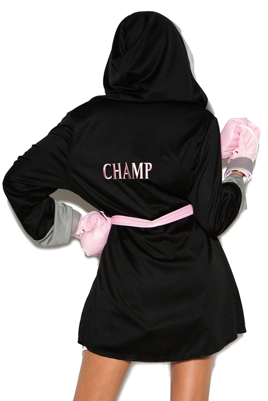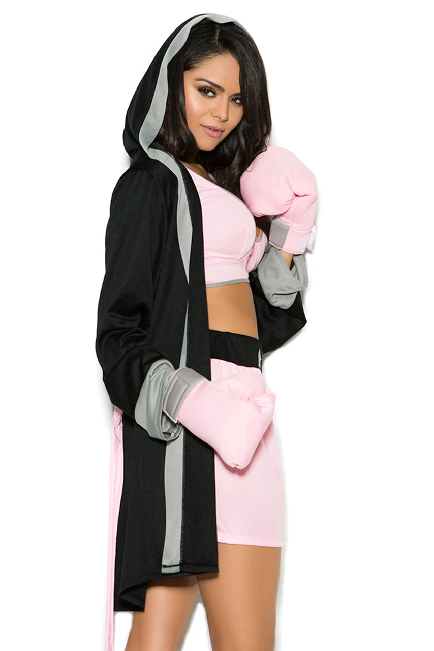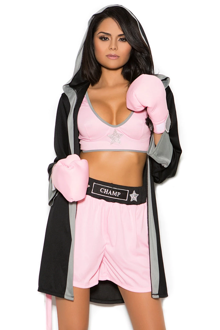 This Prize Fighter costume includes a pink crop top with a low cut bust, pink shorts with “Champ” print, hooded robe, and gloves.