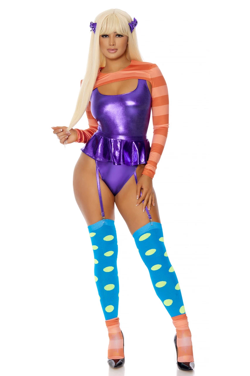 This seven-piece, Bossy Baby costume includes a metallic purple bodysuit with attached garters, contrast striped long sleeve bolero top, a metallic purple peplum skirt, polka dot socks, striped leg accessories, and hairbows.