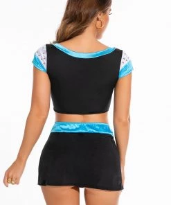 This two-piece, Plus Size Good Luck Charm Cheerleader costume includes a black crop top with a halter neck, peek-a-boo cut out details, contrast stripes, “BBY” print, and a matching pleated micro mini skirt.