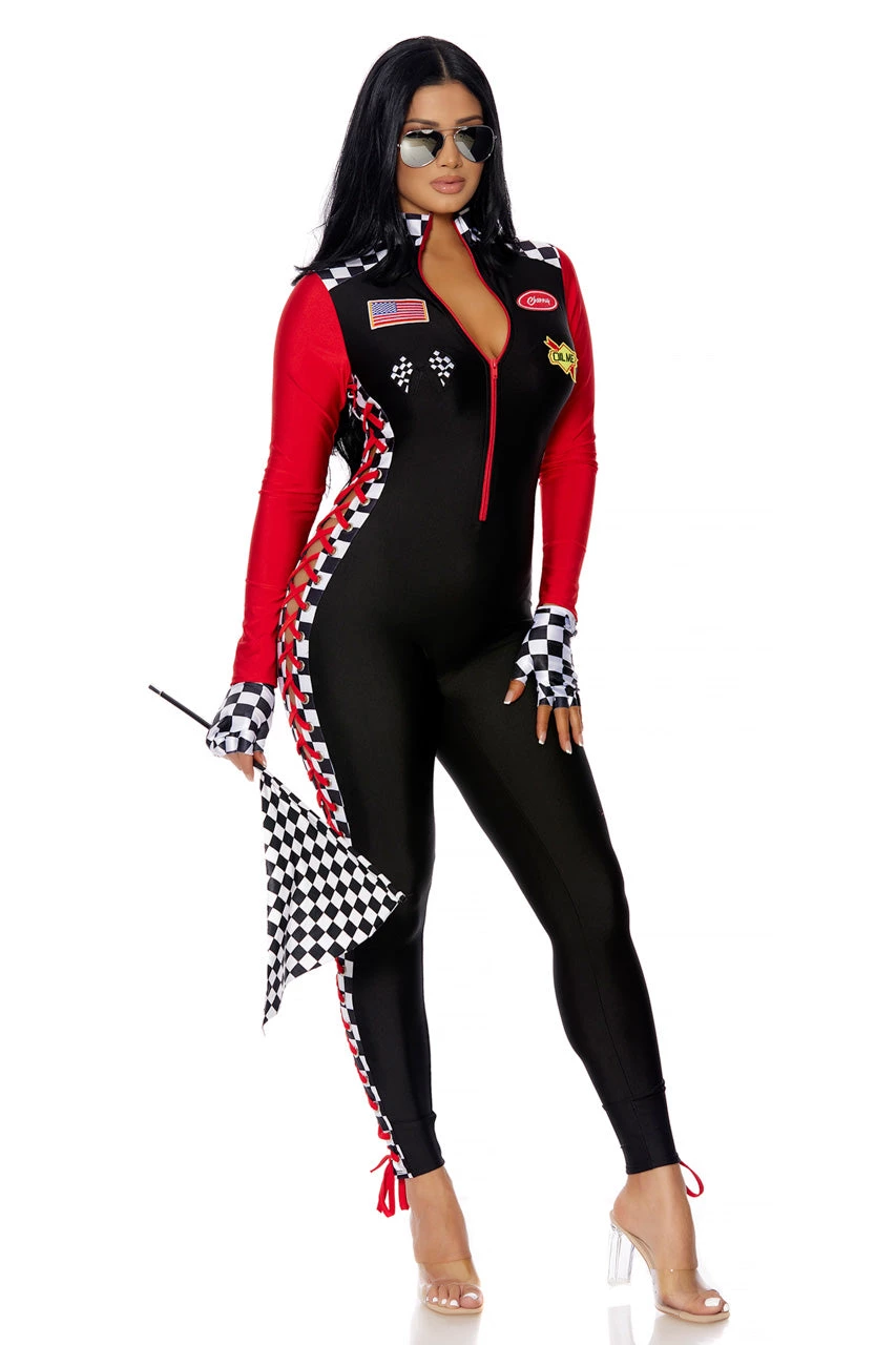 This three-piece, Shift Gears Racer costume includes a black jumpsuit with long sleeves, a zip up front, black and white checker print detail, lace-up sides, racer patches, checker print gloves, and glasses.