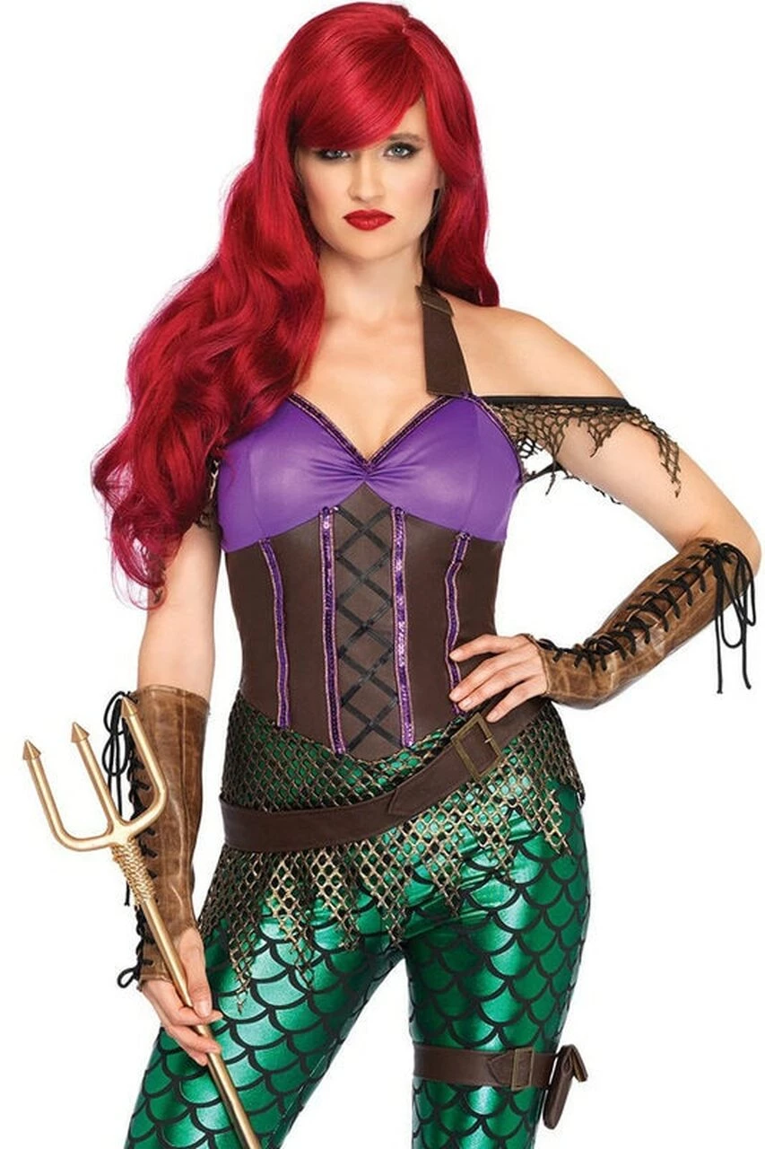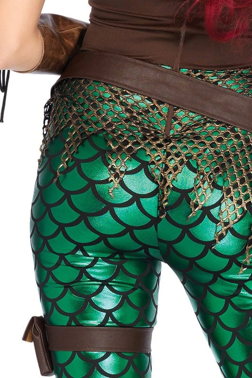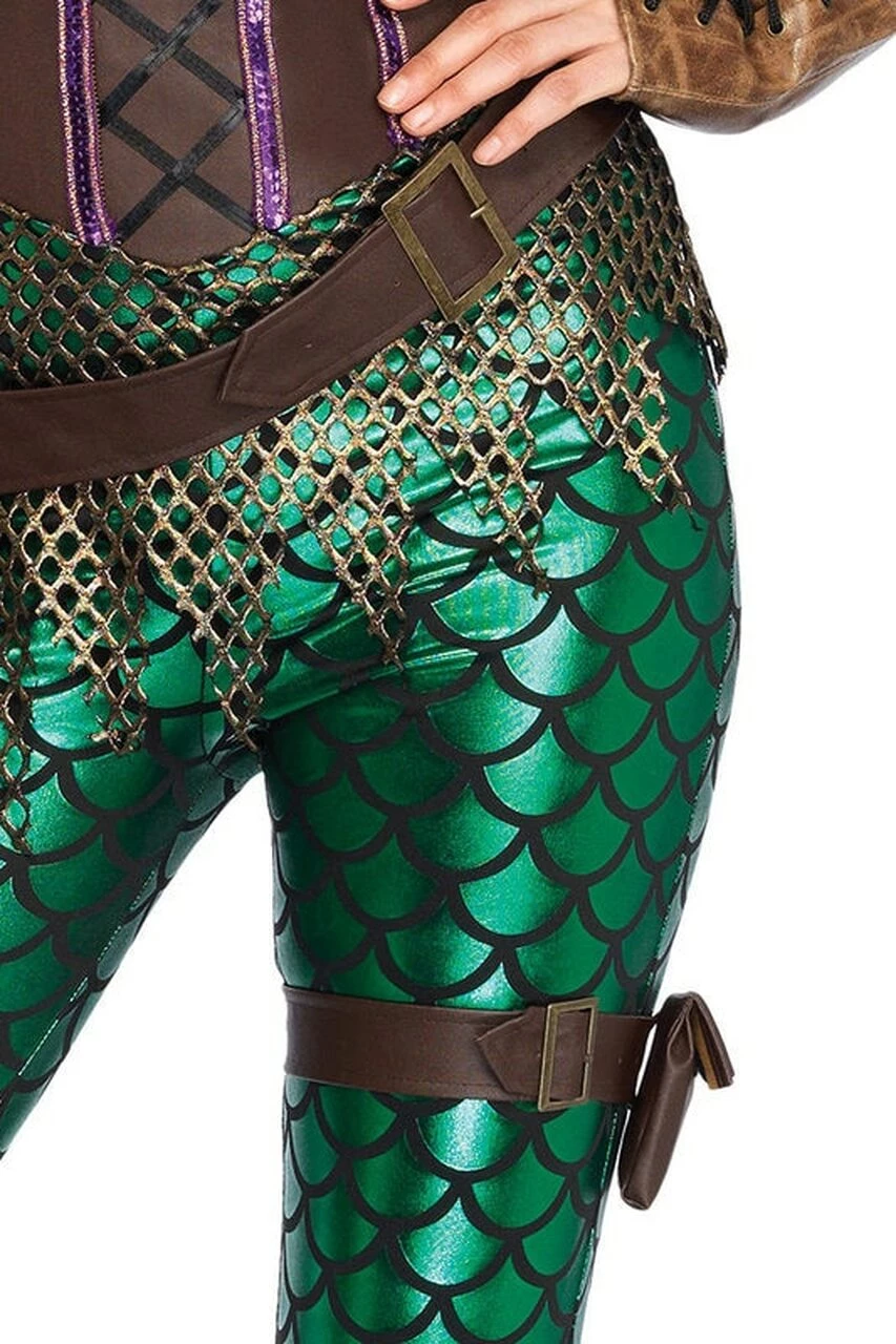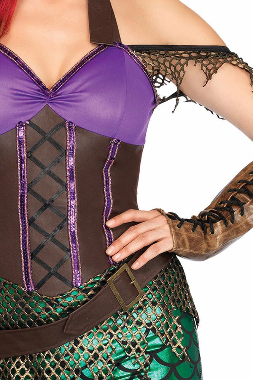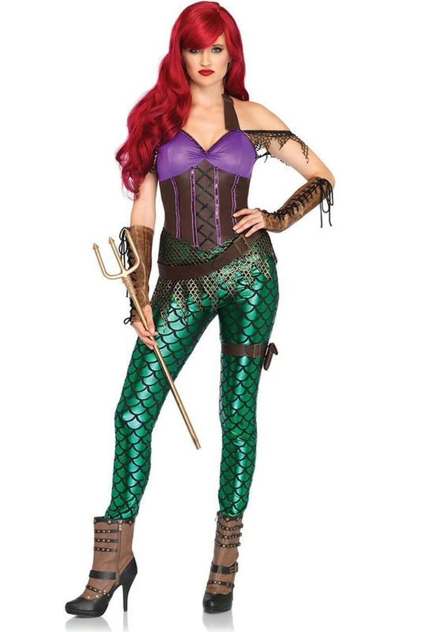 This Mermaid Costume is so Badass that she even has feet. Costume features a sexy mermaid catsuit with scale leggings and a faux leather top. Paired with a hip hugging belt and garter. They won’t dare call you little anymore.