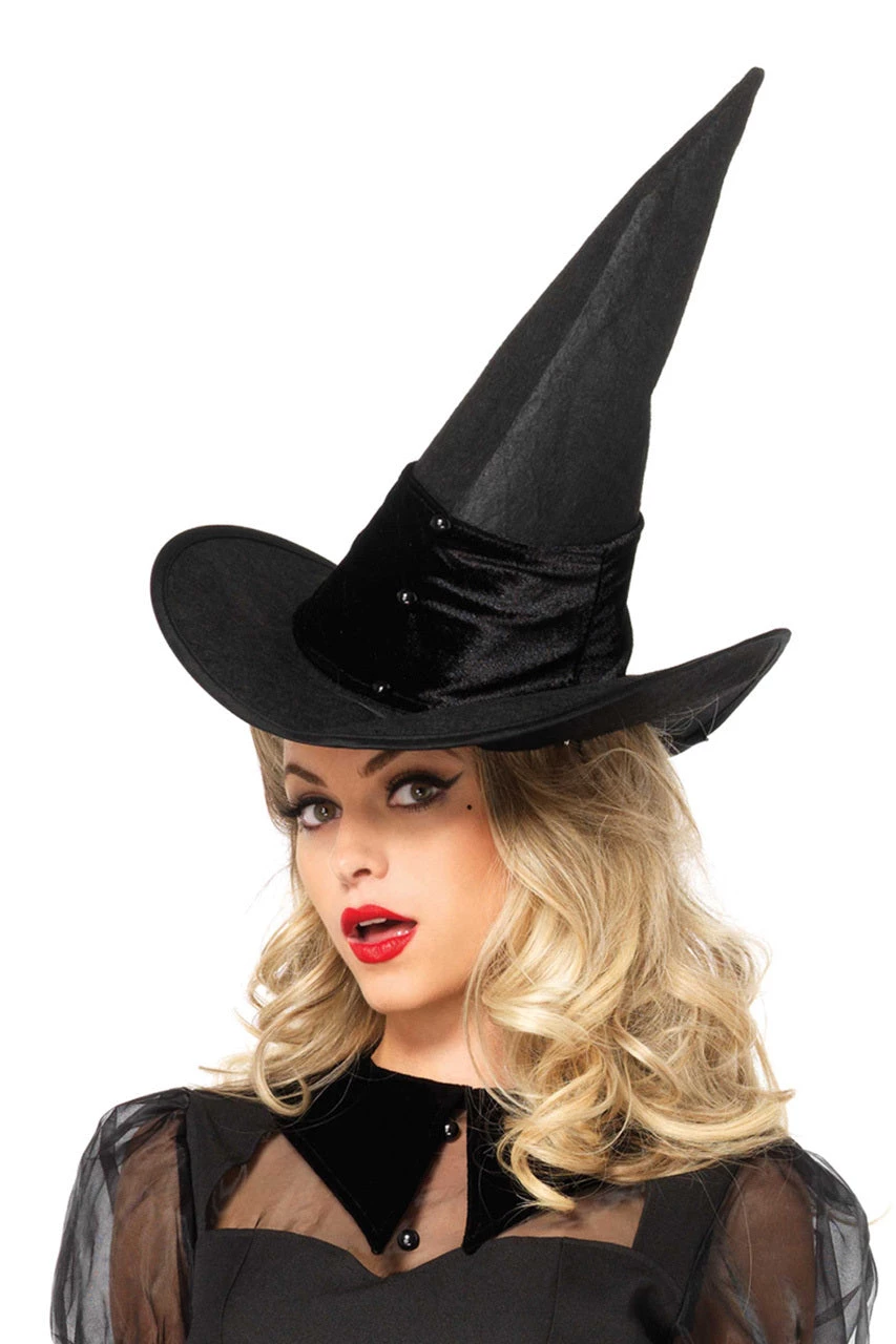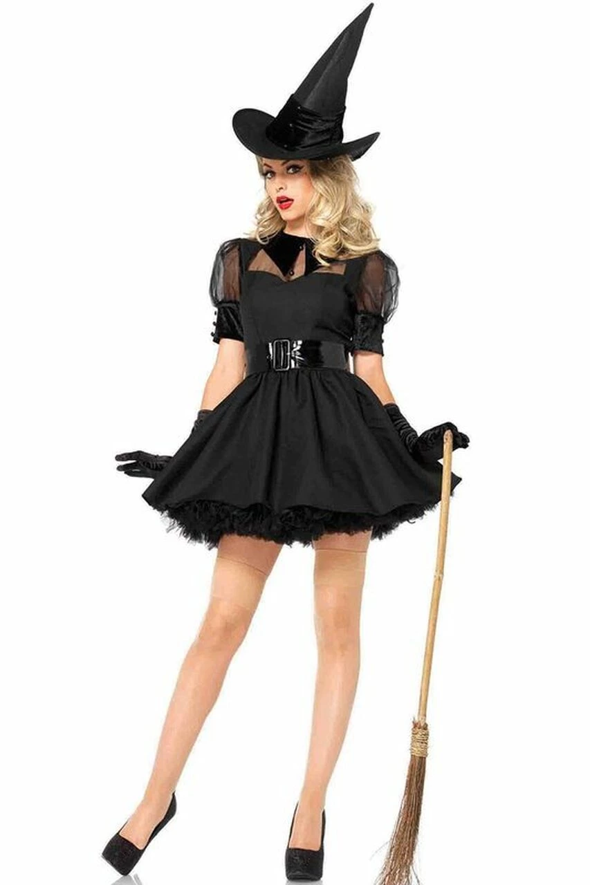 Cast a spell or two in this three-piece, Bewitching Witch costume includes a vintage-style black dress with organza puff sleeves, velvet collar, button details, a wide belt and a matching hat. (Gloves, petticoat and stockings not included.)