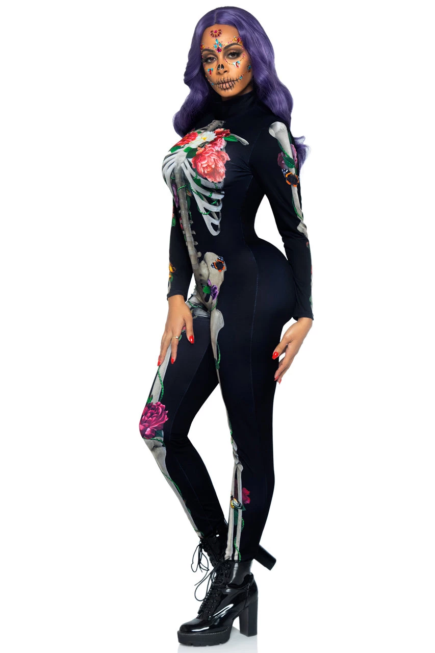 This floral skeleton catsuit features a realistic, floral skeleton print.