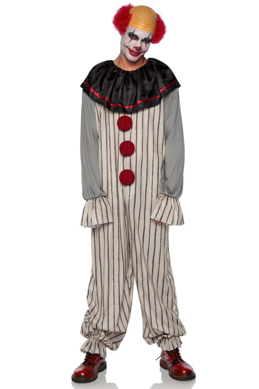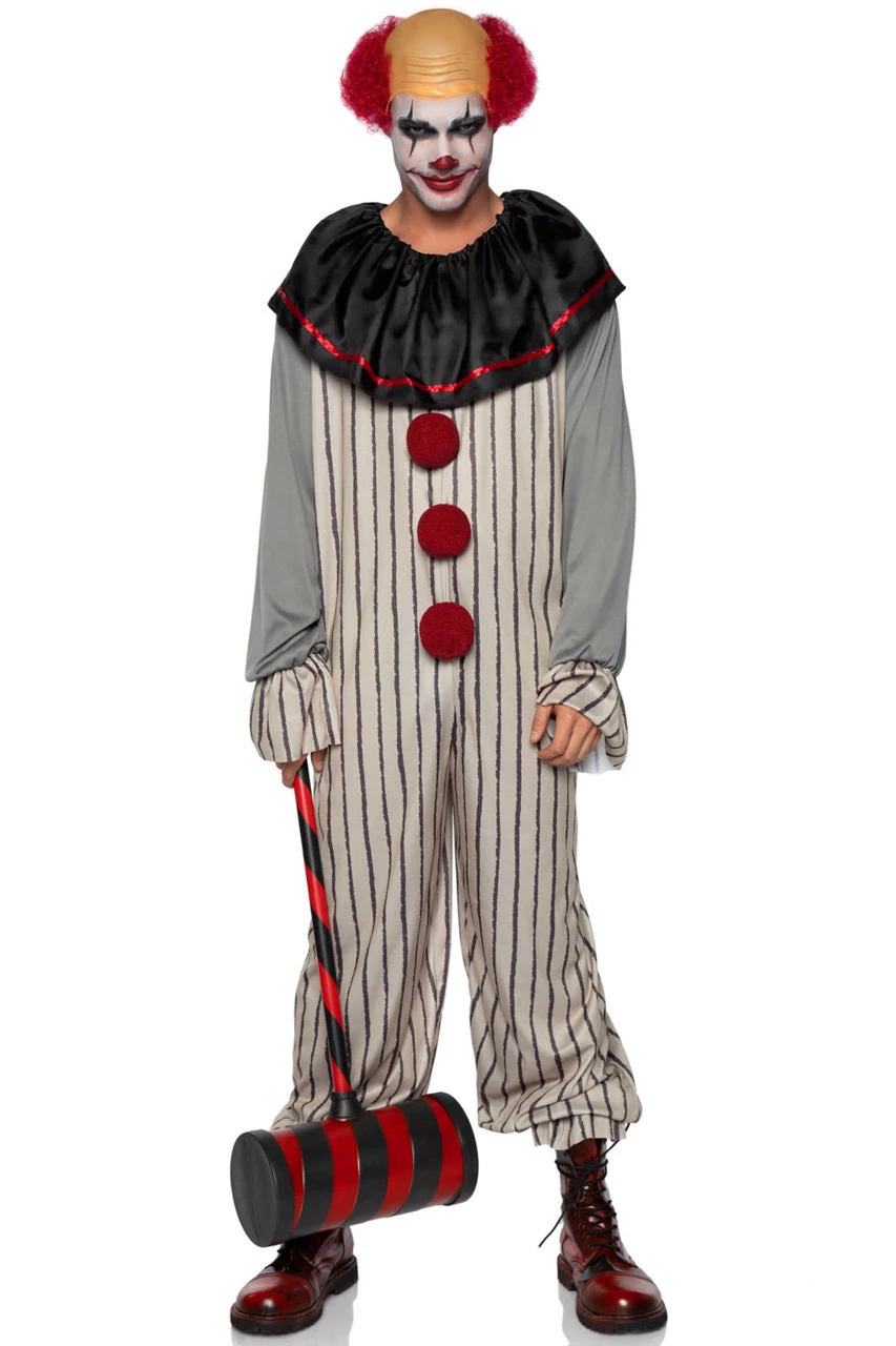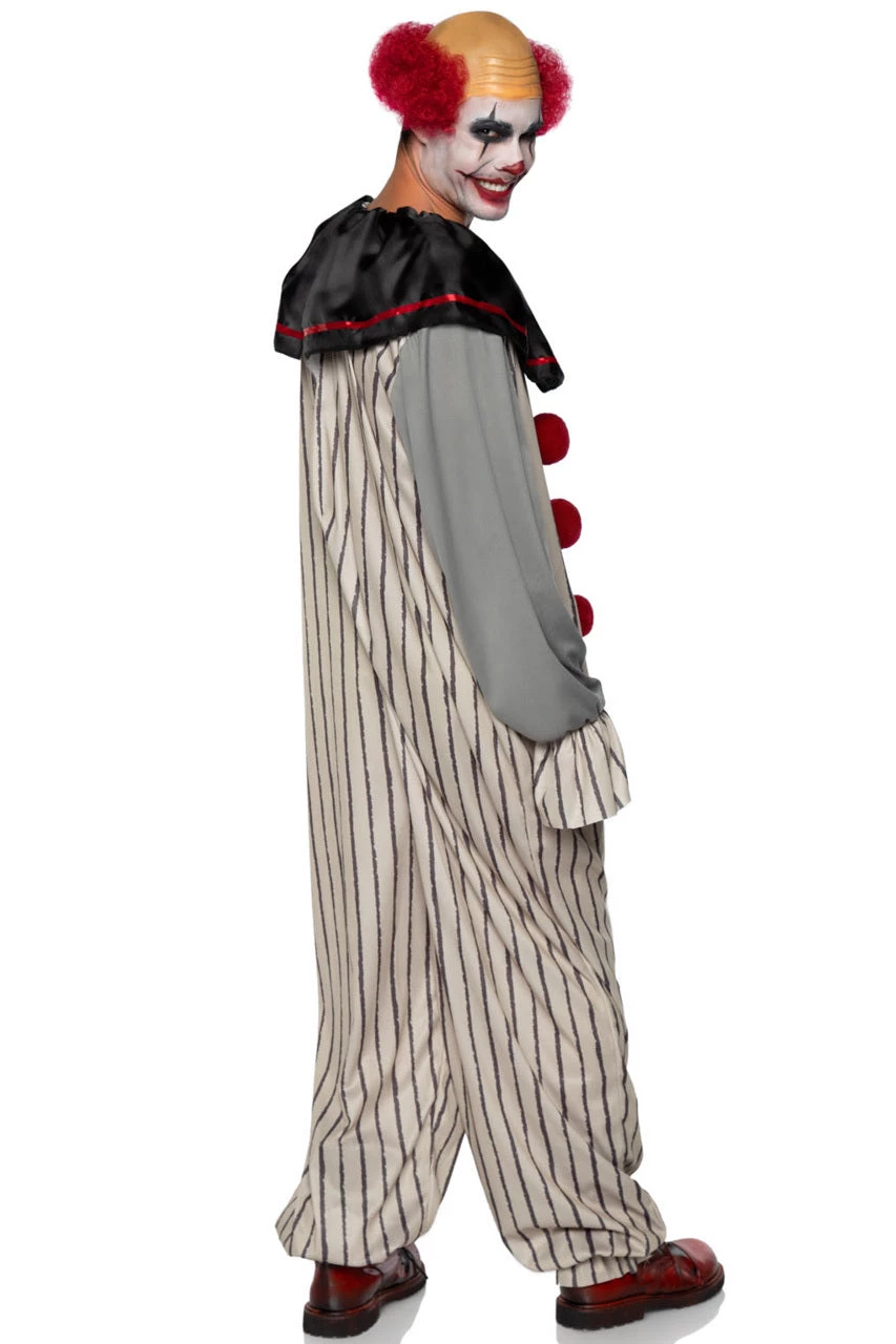 This men’s two-piece Creepy Clown costume includes a striped jumpsuit with red pom pom appliques, a black satin collar and a clown wig.