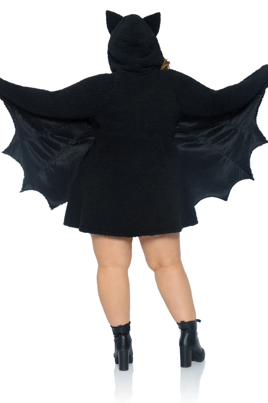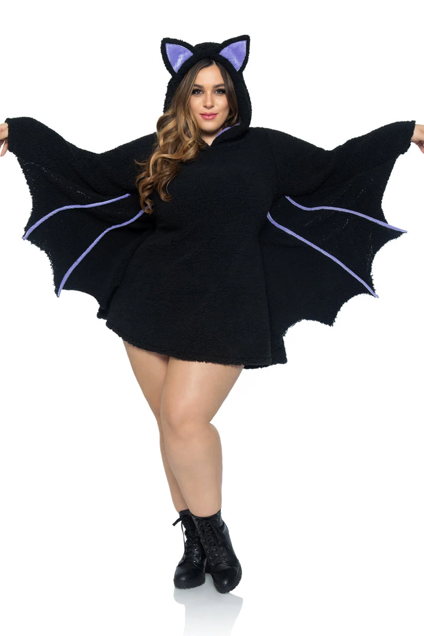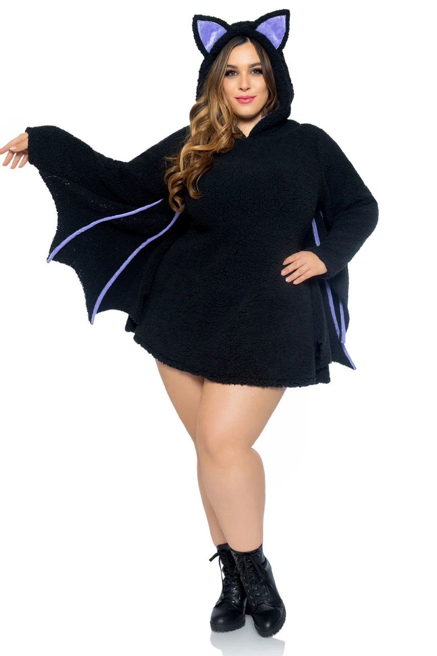 This plus size, Moonlight Bat costume features an ultra-soft, black mini dress with wing sleeves and an ear hood.