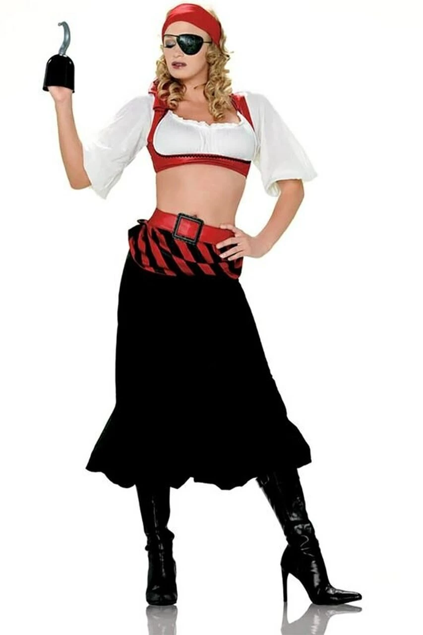 5 Piece Scurvy First Mate Costume includes Headscarf, Eye Patch, Peasant Top, Long Skirt with Belt and Pirate Hook.