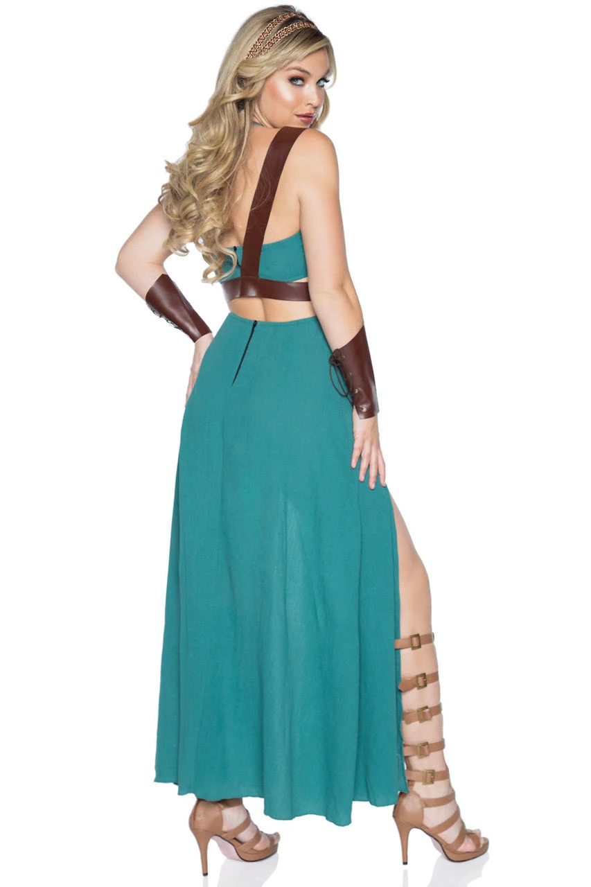 This four-piece Warrior Maiden costume includes a green gauze dress with high cut slits, O-ring detail, a faux leather buckle shoulder harness and matching arm cuffs.