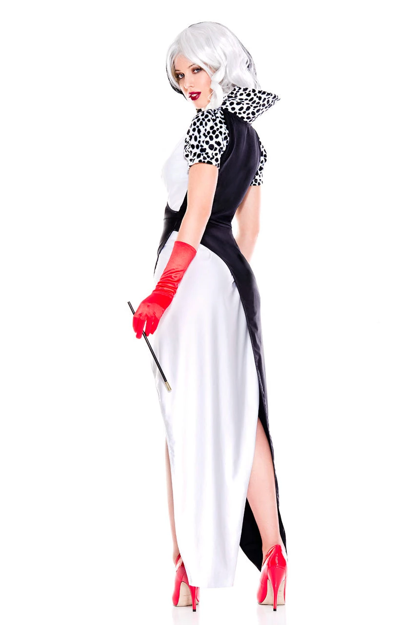 If this costume doesn’t scare them, no evil thing will. You’ll look fabulous dahling in this Cruel Villain costume featuring a black and white dress with a deep V-neckline, short sleeves with a dalmatian print, a black and white peplum, a long black skirt with a side slit, a tall collar with a dalmatian print, red satin gloves, and a black cigarette holder. (Wig not included.)
