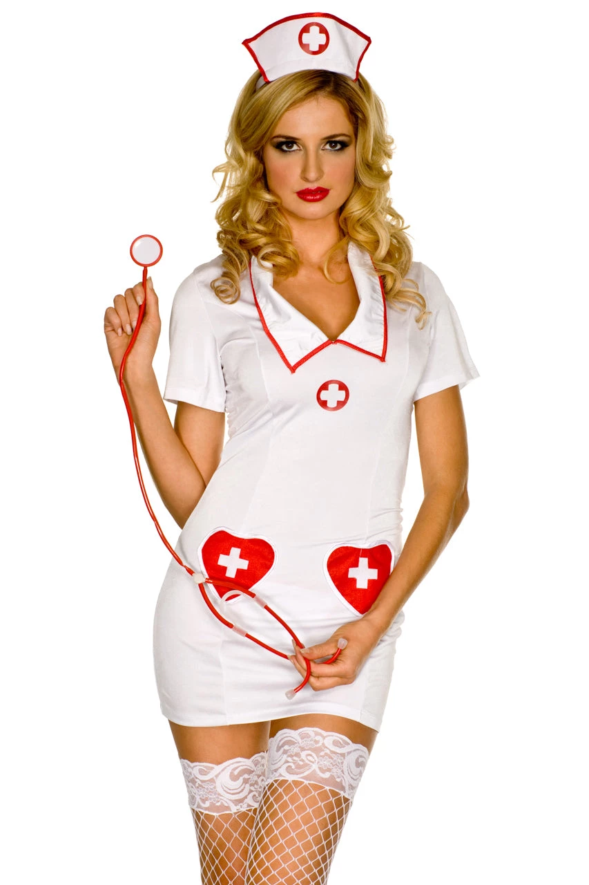 This Night Nurse Halloween costume includes a white mini dress with red cross details, red trim, and matching hat headband. (Stockings and stethoscope not included.)