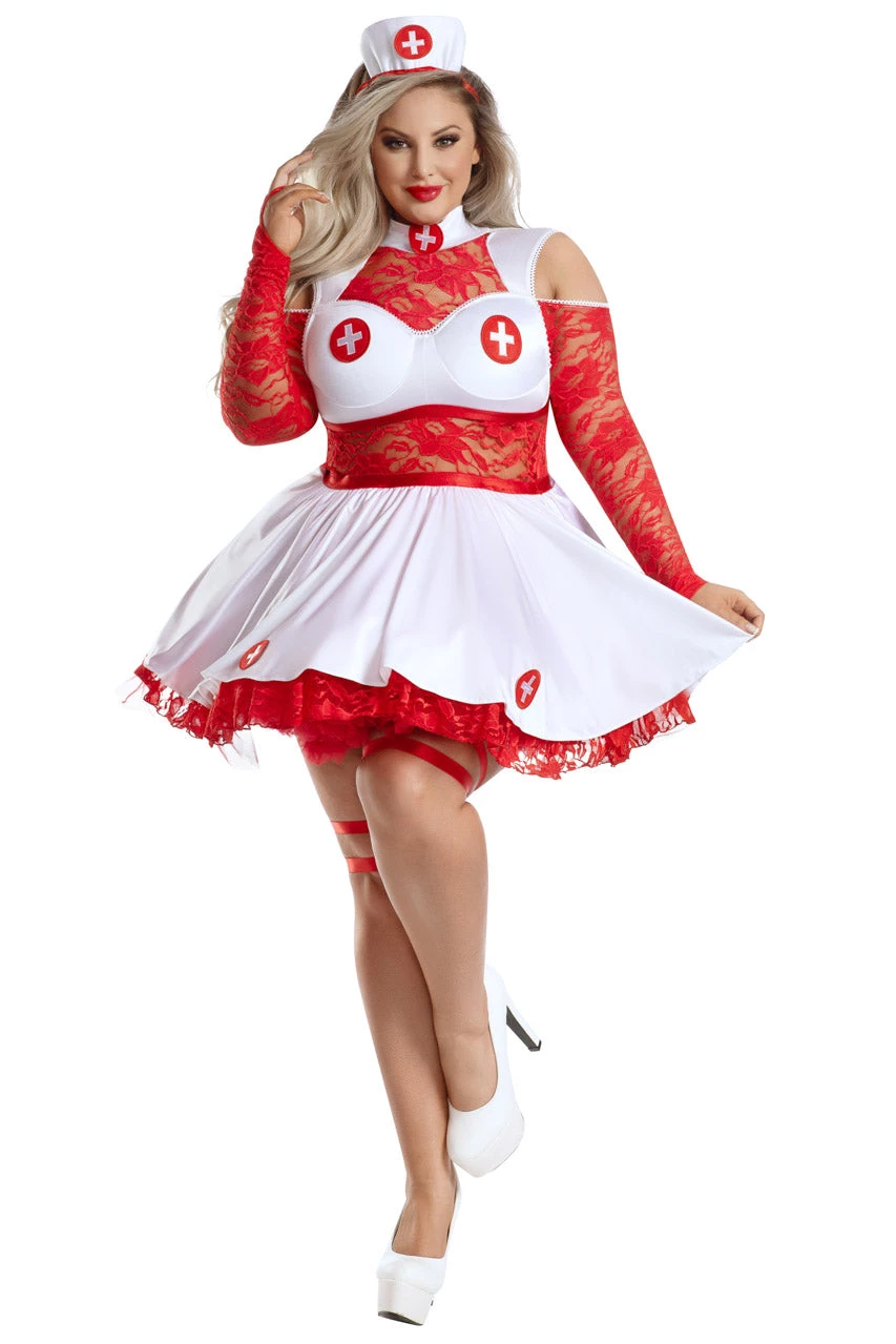 This plus size, Nurse Lacey costume includes a white dress with red lace panels, long red lace sleeves, red cross patches, attached leg garters, and a matching headpiece. (Petticoat not included.)