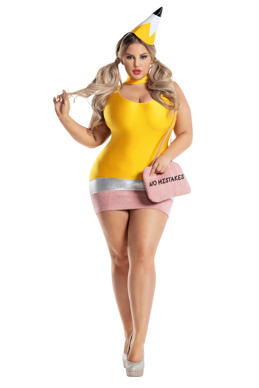 This plus size, Pretty Pencil costume includes a yellow bodycon dress with silver lamé detail, pink suède hem, a cut out bust, a matching pencil headpiece, and a pink suède “no mistakes” purse.