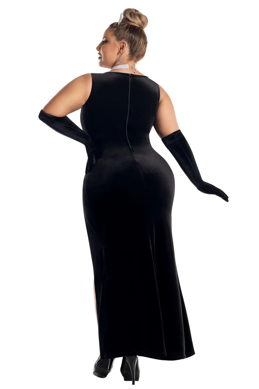 This plus size, Tiffany Honey costume includes a long, black Velvet bodycon dress with built-in bodysuit, a mini tiara, oversized sunglasses, necklace, clip-on earrings, cigarette holder, and matching gloves.
