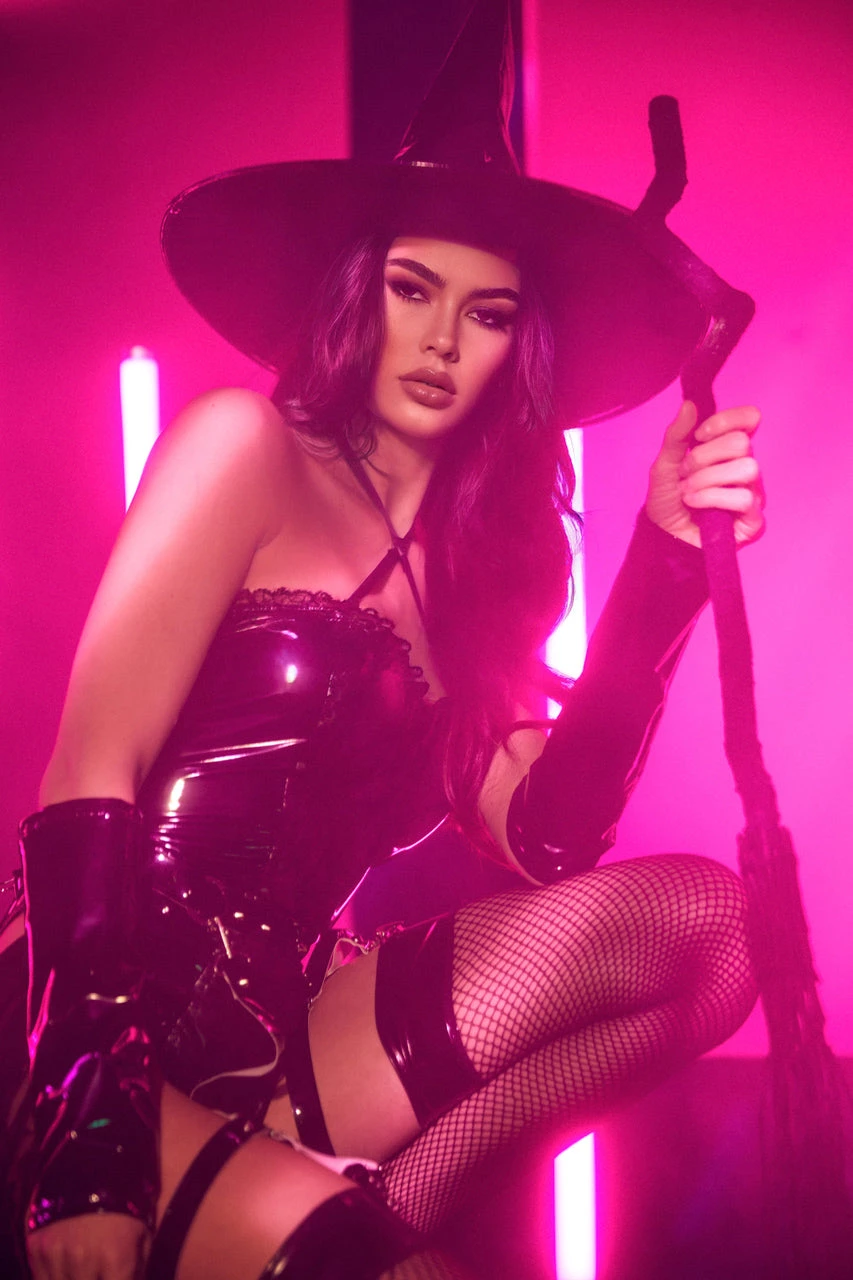This three-piece, Bewitching Beauty costume includes a black vinyl bodysuit with a lace overlay front, lace trim, criss cross bust, a black vinyl garter belt with stud details, and a black vinyl witch hat. (Broom not included.)