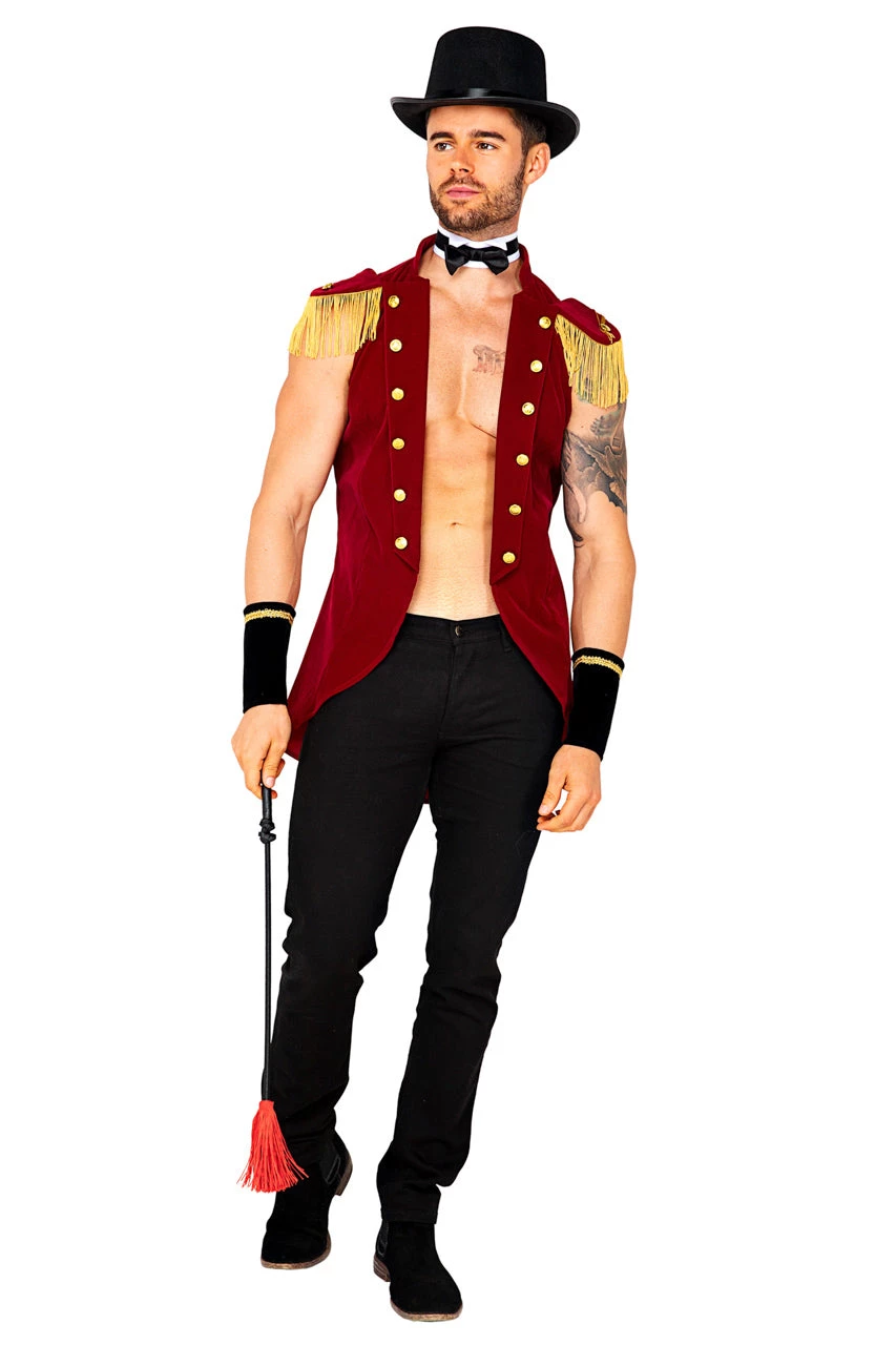 This four-piece, Big Top Master costume includes a collar with bowtie, red velvet jacket with gold fringe epaulettes, wrist cuffs, and hat. (Pants not included.)