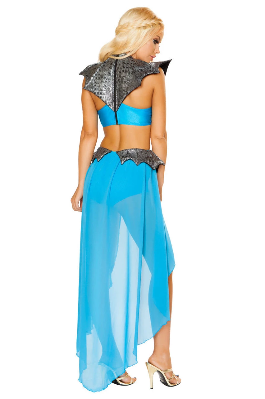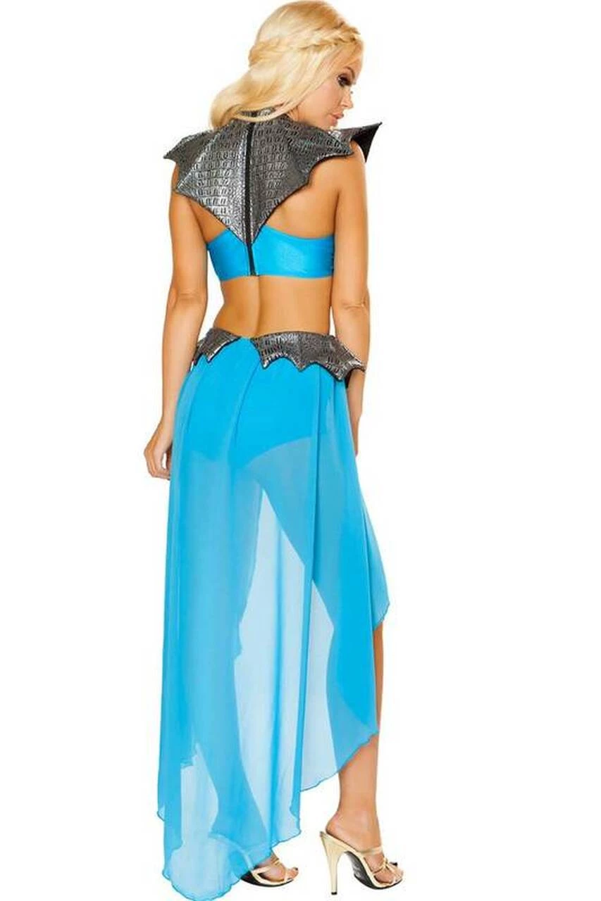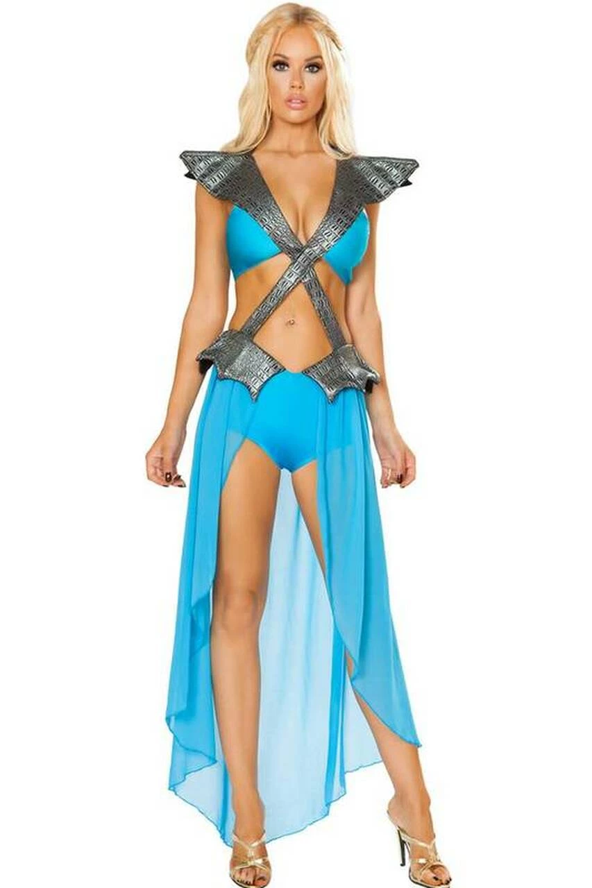 Lead them into battle in this Mother of Dragons costume featuring a blue bodysuit with cut out details, attached mesh overskirt, silver dragon cross body details and a zip up back.