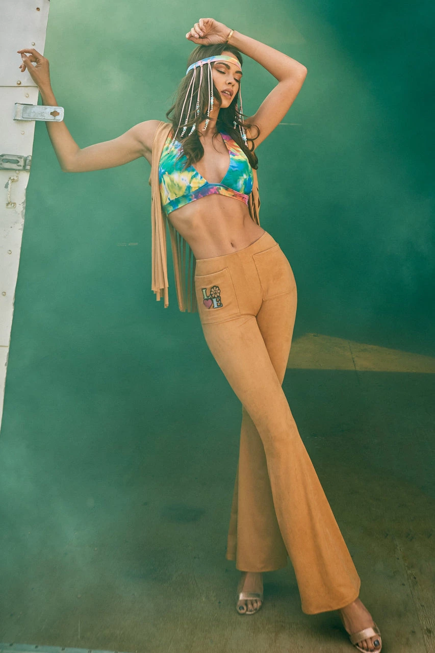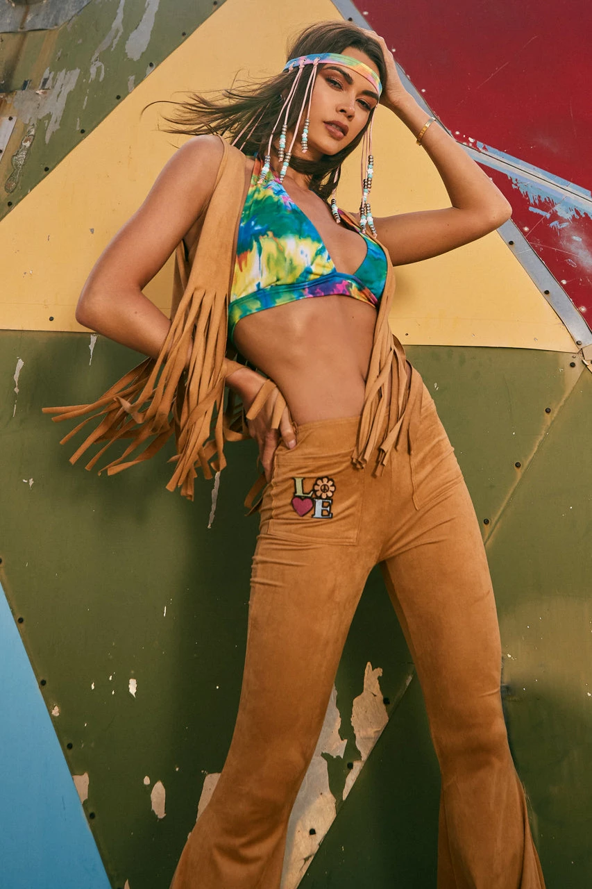 This three-piece, Peace and Love Hippie costume includes a tie dye print bra top, a suede fringe vest, and suede bell bottom pants with LOVE patch.