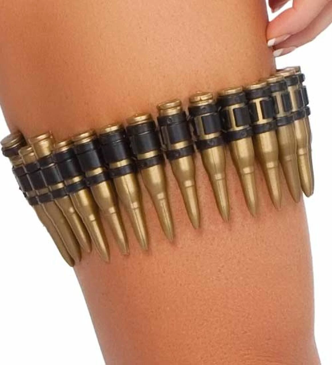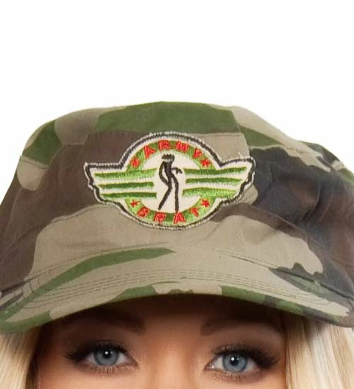 This four-piece Ready for Action Militar costume includes a camo print romper with cross-over straps, faux buckle belt, halter neck, tie back, belt, hat, and a faux bullet leg garter.