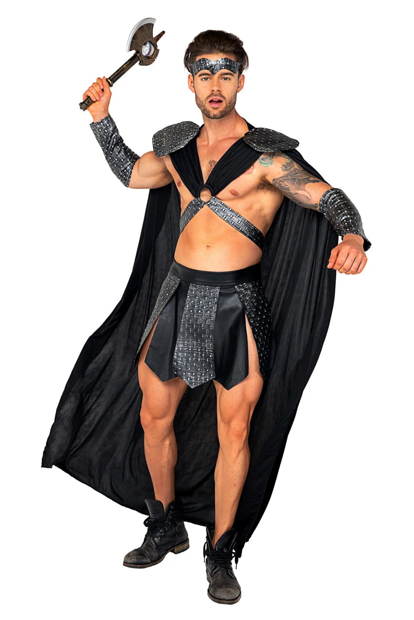 This four-piece, Valiant Gladiator costume includes a harness with attached cape, wrist gauntlets, a skirted bottom, and headpiece. (Axe not included.)