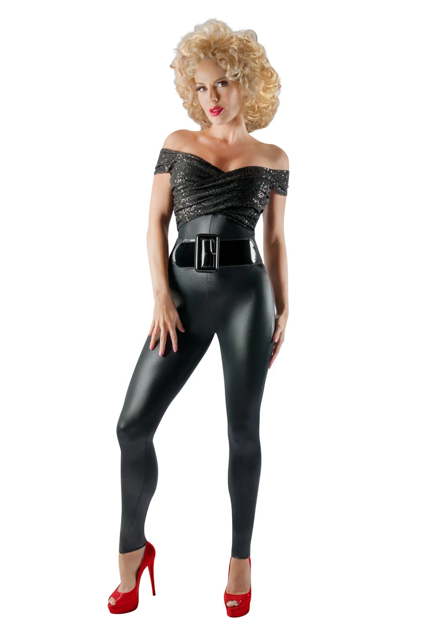 This Dark Sandy costume includes a black catsuit with a black glitter top, off the shoulder sleeves, wet look spandex pants, and a black patent leather belt.